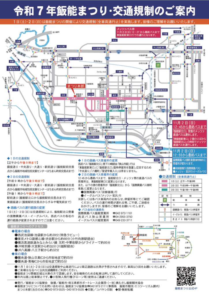 2025年11月1日(土)、11月2日(日)開催の「飯能まつり」交通規制にともない、路線バスの運行経路の変更やバス停の変更、休止などがあります。