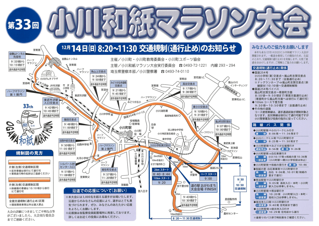 小川町内では「小川和紙マラソン大会」開催による交通規制が実施されます。これに伴い、「小川町駅~白石車庫間路線バス」は交通規制時間帯に運行する以下運行便について”運転変更または運休”をいたします。ご迷惑をお掛けいたしますが、ご利用の際は十分ご注意願います。