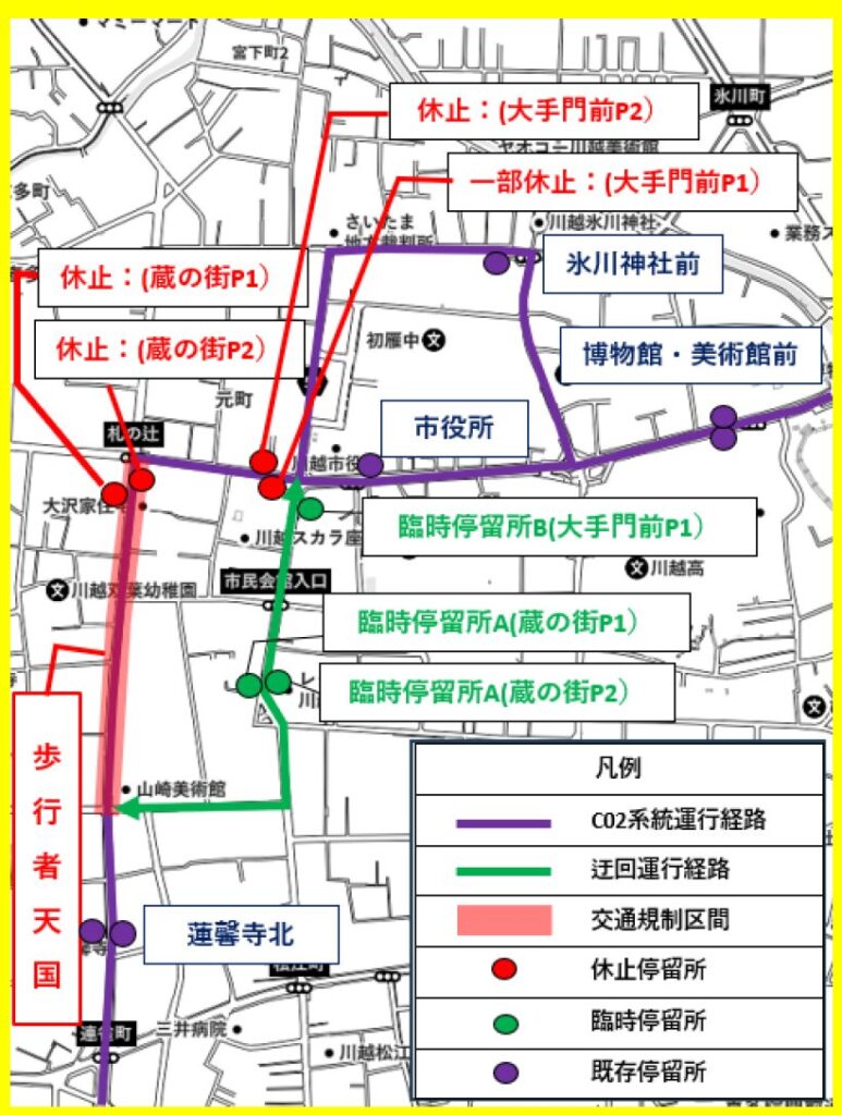 小江戸巡回バスは「川越・一番街歩行者天国の試行的実施」に伴い、下記のとおり、バス停留所の移設及び運行経路の変更を行います。